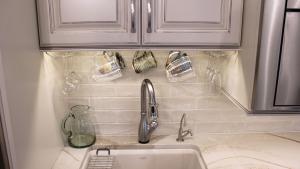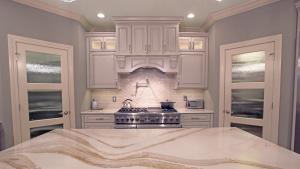 The owners decided to remodel this Caseyville, IL kitchen to update the layout, design, and color scheme. The updated layout included relocating the cooking space adding a 48” commercial-grade range, pot-filler for range cooktop, custom wood-hood venting moved to the feature-wall, a larger prep island, “Corded” 3-panel glass pantry doors, a 2nd prep sink for wine/coffee bar, under-counter wine/beverage fridge, and a built-in coffee-machine for their new wine/coffee bar. Features of this kitchen included Diamond cabinetry with a “Sullivan” door style in “Dover Greystone” color, LED undercabinet/recessed can lighting, “Corded” glass upper cabinet doors with LED in-lighting, Cambria “Britannica Gold” countertops with an Ogee edge profile, Kohler Whitehaven cast-iron undermount apron farm-sink, touch-sensitive Delta Leland faucets, and “CTI-Marlow” glossy tile subway backsplash in a “desert” color with herringbone feature area above the range. The expanded island became a centerpiece for the kitchen with decorative pendant lighting and the homeowners decided to use a contrasting color for the cabinetry- Diamond with a “Sullivan-Maple” door style in a “Kodiak” stain color completed with finished doors and decorative corbels. Overall, the new kitchen leaves the viewer breathless, and the family will be able to enjoy their new space for many years to come!